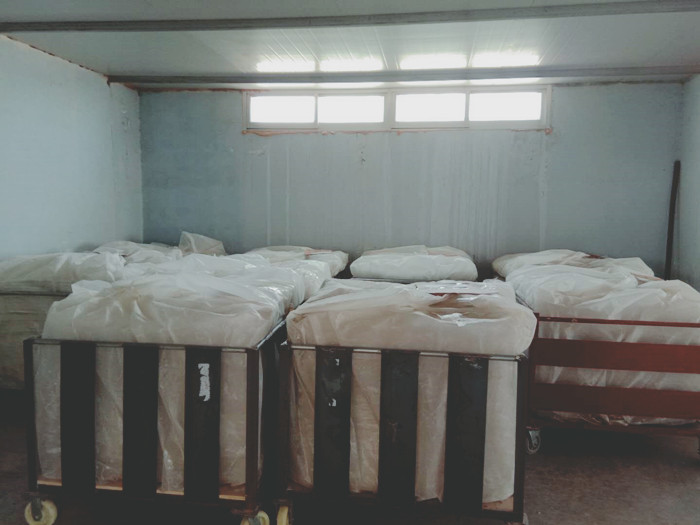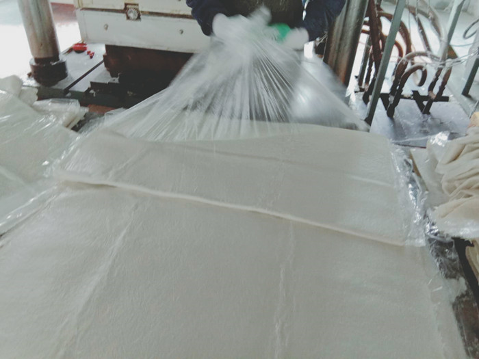 經過熟化期的片材就可以放入模壓機進行模壓了,在模壓之前要嚴格稱重每塊水箱板需要的片材重量,以每塊水箱板都是標準重量。進入模壓機之前還要把包裹片材的塑料膜撕下,才能放入模壓機。
