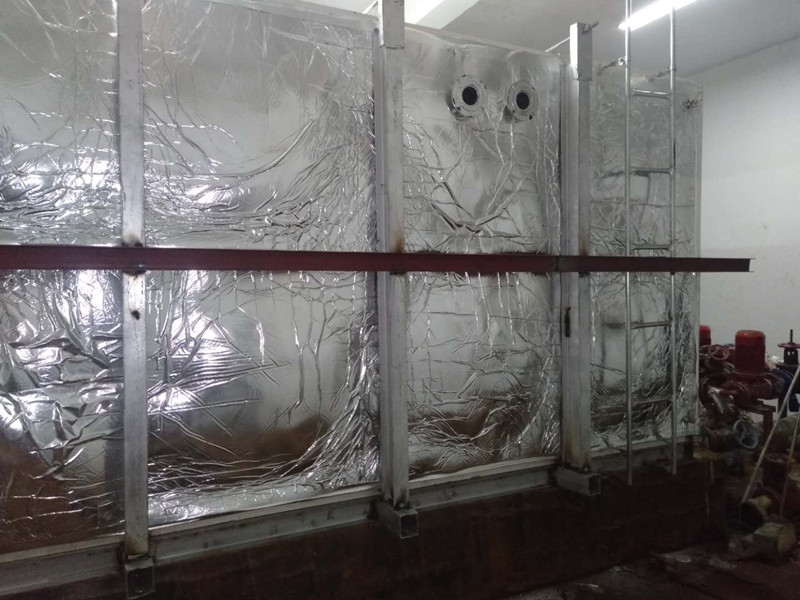 玻璃鋼無內件外加固保溫水箱設計內加強結構型式,水箱箱體為型板裝配氬弧焊接而成,型板拼裝交叉部位設計雙向加強聯桿。箱體側板與底板間設置垂直加固柱,水箱側板四周外每層相鄰。型板間設置水平加強板,加強材料同箱體材料。水箱底部設置鍍鋅槽鋼支架。水箱附件有檢查孔、內外扶梯、工藝管口、材料均為不銹鋼,水箱工藝管口按用戶提供的圖樣設計。